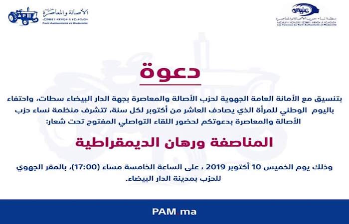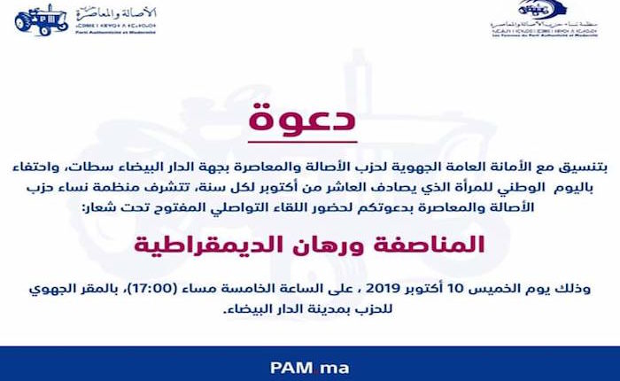 احتفاء باليوم الوطني للمرأة، الذي يصادف العاشر من أكتوبر من كل سنة، تعقد منظمة نساء الأصالة والمعاصرة بجهة الدار البيضاء – سطات، يوم الخميس 10 أكتوبر 2019، لقاء تواصليا مفتوحا لنساء الحزب تحت عنوان “المناصفة ورهان الديمقراطية”، وذلك بالمقر الجهوي للحزب بالدار البيضاء.