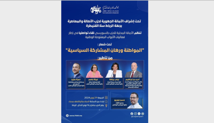 تحت إشراف الأمانة الجهوية لحزب الأصالة والمعاصرة بجهة الرباط سلا القنيطرة؛ تنظم الأمانة المحلية للحزب بالسويسي؛ لقاء تواصليا في إطار فعاليات الأبواب المفتوحة الوطنية