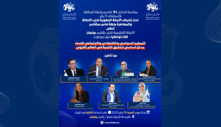 تحت إشراف الأمانة الجهوية لحزب الأصالة والمعاصرة بجهة فاس مكناس، تنظم الأمانة الإقليمية للحزب بإقليم بولمان، لقاء تواصليا حول موضوع: