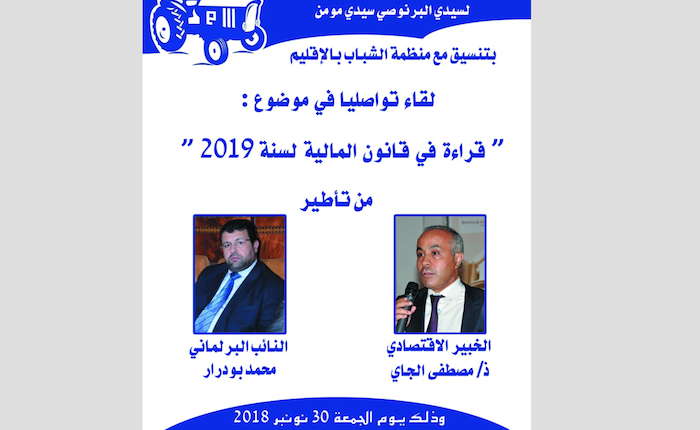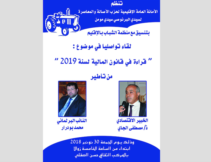 تنظم الأمانة الإقليمية لحزب الأصالة والمعاصرة بسيدي مومن سيدي البرنوصي بالدار البيضاء بتنسيق مع منظمة الشباب بالإقليم، يوم الجمعة 30 نونبر 2018 بالمركب الثقافي حسن الصقلي ابتداء من الساعة الخامسة مساءا، لقاءا تواصليا في موضوع “قراءة في قانون المالية 2019”.