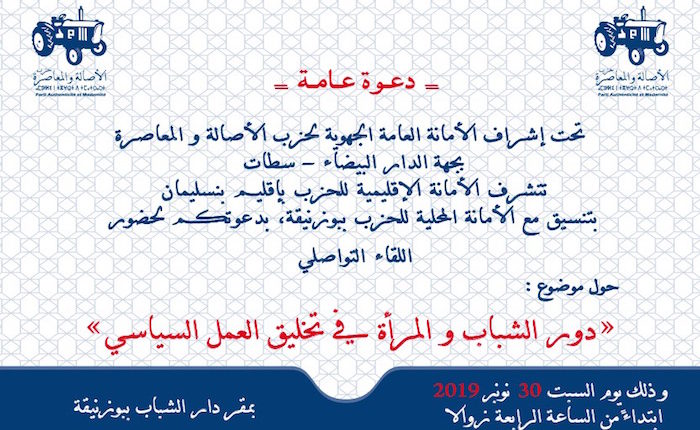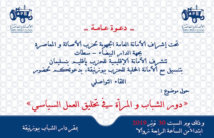 تحت اشراف الأمانة العامة الجهوية لحزب الأصالة والمعاصرة بجهة الدار البيضاء سطات، تنظم الأمانة الإقليمية للحزب بإقليم بنسليمان بتنسيق مع الأمانة المحلية للحزب ببوزنيقة، يوم السبت 30 نونبر 2019 ابتداء من الساعة الرابعة زوالا بمقر دار الشباب ببوزنيقة، (تنظم) لقاء تواصليا حول موضوع “دور الشباب والمرأة في تخليق العمل السياسي”.