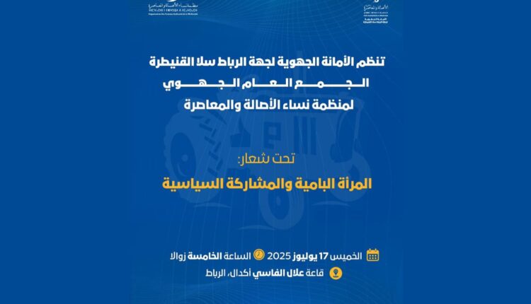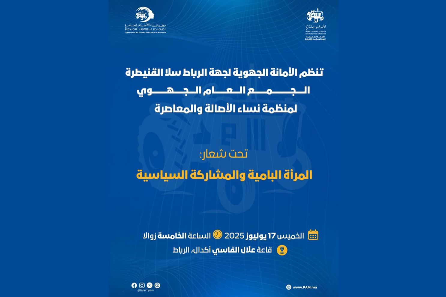 في إطار تعزيز دينامية العمل النسائي ودعم حضور المرأة في المشهد السياسي، تعقد الأمانة الجهوية لحزب الأصالة والمعاصرة بجهة الرباط سلا القنيطرة الجمع العام الجهوي لمنظمة نساء الحزب، وذلك يوم الخميس 17 يوليوز 2025، ابتداء من الساعة الخامسة مساء، بقاعة علال الفاسي بحي أكدال، الرباط.