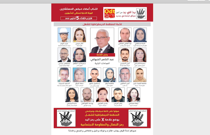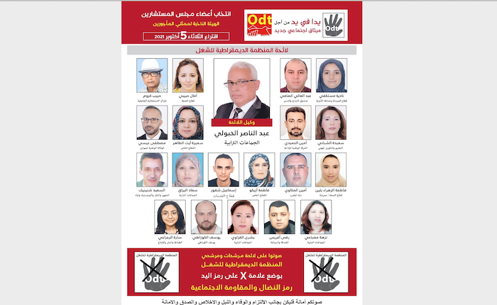 وتضم لائحة المنظمة الديموقراطية للشغل، عددا من الأطر والكفاءات، في مقدمتهم وكيل اللائحة الأستاذ عبد الناصر الخبولي ، كما تضم اللائحة، شباب ونساء من مختلف القطاعات، والخدمات، سواء في القطاع العام والخاص يعتبرون صفوة من مناضلات ومناضلي المنظمة، والمتسمين بصفات الصدق والنزاهة والمصداقية والالتزام بالأخلاق الحميدة والاستمرار في النضال والكفاح من أجل كرامة الطبقة العاملة وصون حقوقها الاجتماعية والإنسانية والتجربة والقدرة على الترافع وطرح البدائل والمساهمة في التشريعات والسياسات الاجتماعية الهادفة إلى تحسين الوضع المعيشي للطبقة العاملة.
