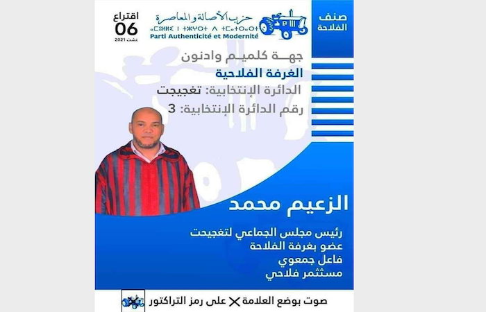 وإلتزم مرشح حزب الأصالة والمعاصرة لغرفة الفلاحة -صنف الفلاحة- بالدائرة 3 تغجيجت، بالعمل على تأهيل وتشجيع القطاع الفلاحي، من خلال تقوية الاستثمار في هذا القطاع الحيوي والواعد بجهة كلميم وادنون.