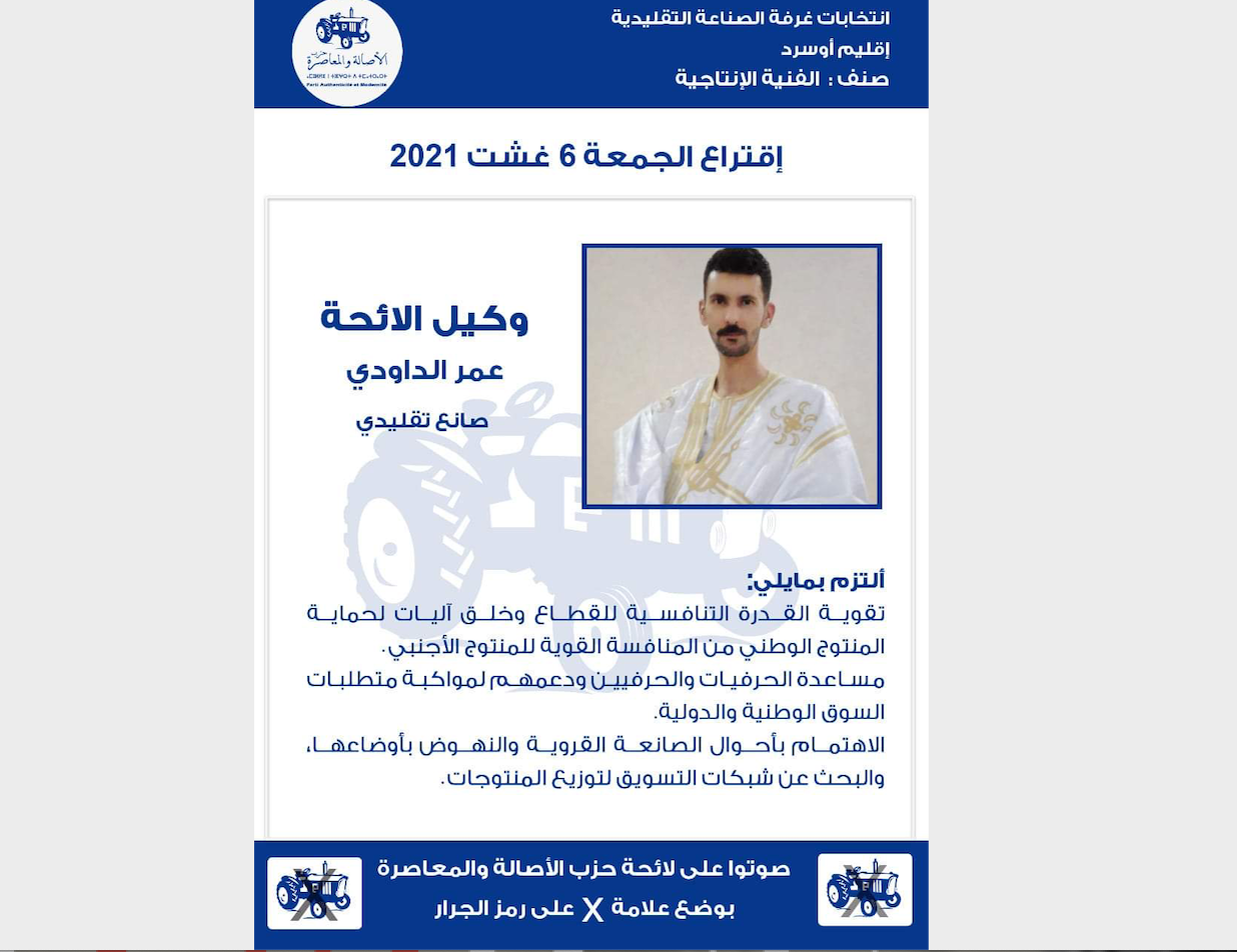 الانتخابات المهنية.. عمر الداودي يتعهد بجعل الصناعة التقليدية رافعة تنموية بجهة الداخلة وادي الذهب