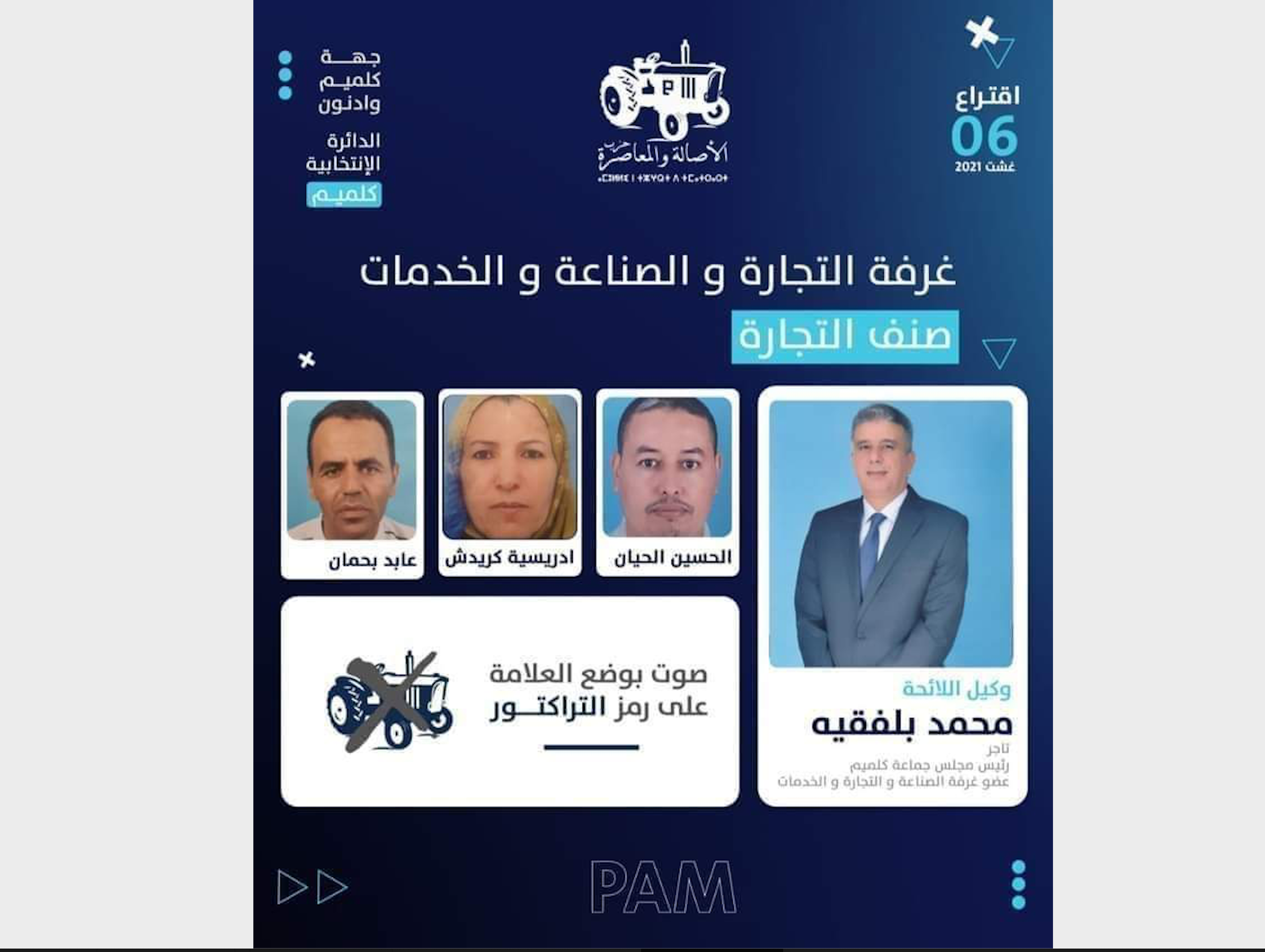 للإشارة فإن لائحة انتخاب أعضاء غرفة التجارة والصناعة والخدمات -صنف التجارة- بجهة كلميم وادنون، دائرة كلميم، تضم إلى جانب السيد محمد بلفقيه الفاعل السياسي رئيس الجماعة الحضرية كلميم وعضو غرفة التجارة والصناعة والخدمات، تضم كل من السيد الحسين الحيان، والسيدة ادريسية كريديش، والسيد عابد بحمان وكلهم فاعليين مهنيين بقطاع التجارة.