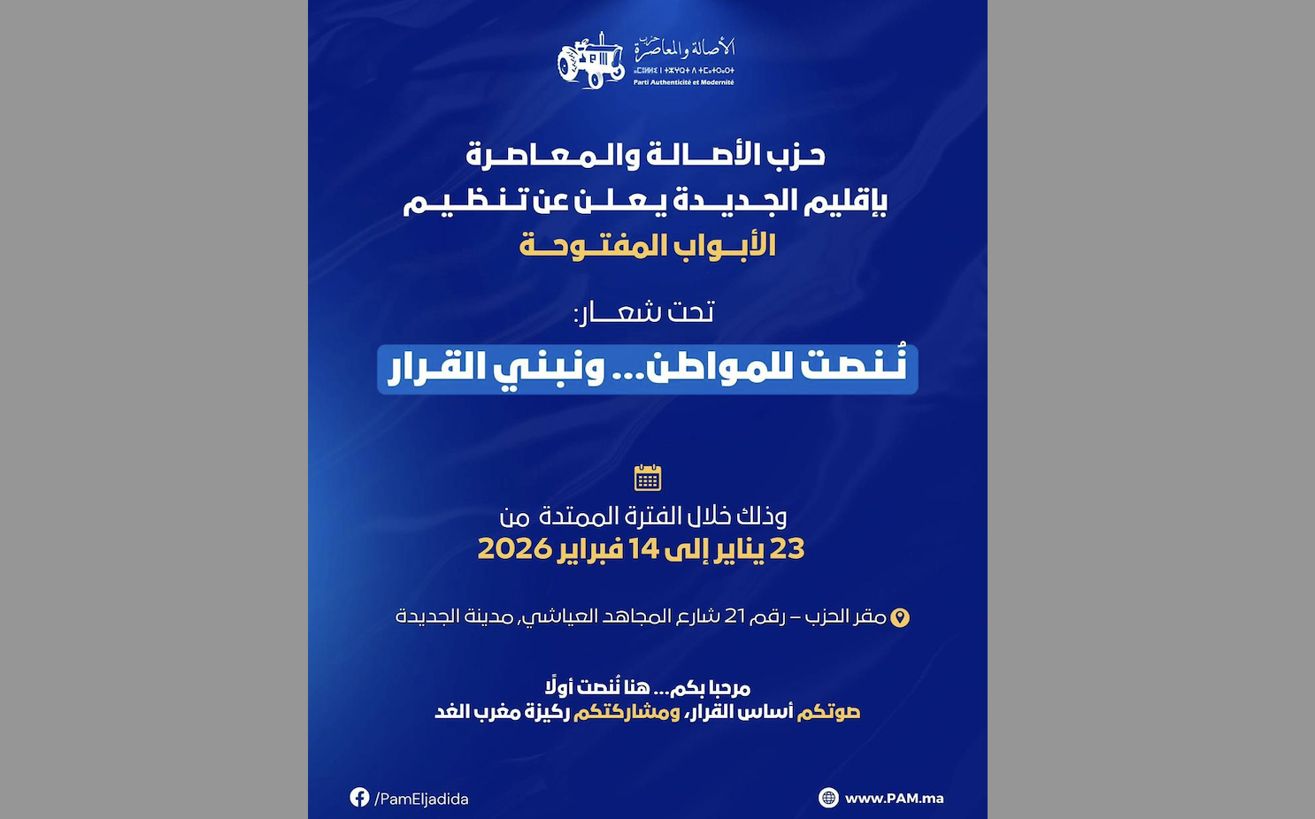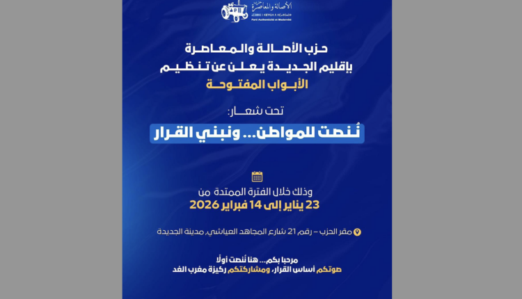 في خطوة تعكس انخراطه في ترسيخ سياسة القرب وتعزيز التواصل المباشر مع المواطنات والمواطنين، أعلن حزب الأصالة والمعاصرة بإقليم الجديدة عن تنظيم مبادرة الأبواب المفتوحة بمقره الكائن بشارع المجاهد العياشي رقم 21 بمدينة الجديدة، وذلك خلال الفترة الممتدة من 23 يناير إلى 14 فبراير 2026.