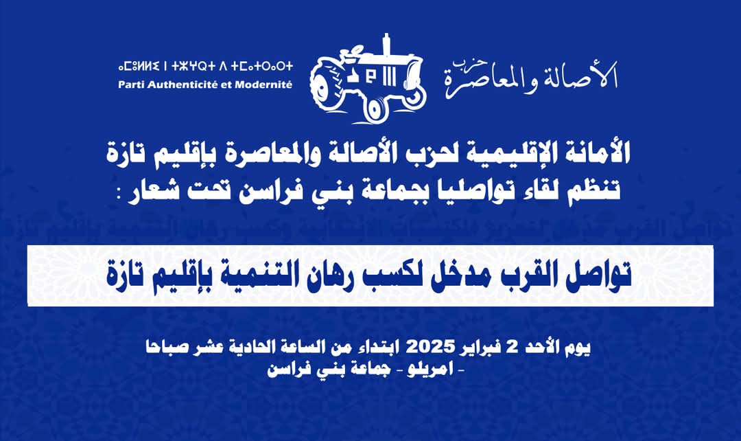 تنظم؛ الأمانة الإقليمية لحزب الأصالة والمعاصرة بإقليم تازة؛ لقاء تواصليا بجماعة بني فراسن تحت شعار: “تواصل القرب مدخل لكسب رهان التنمية بإقليم تازة”.