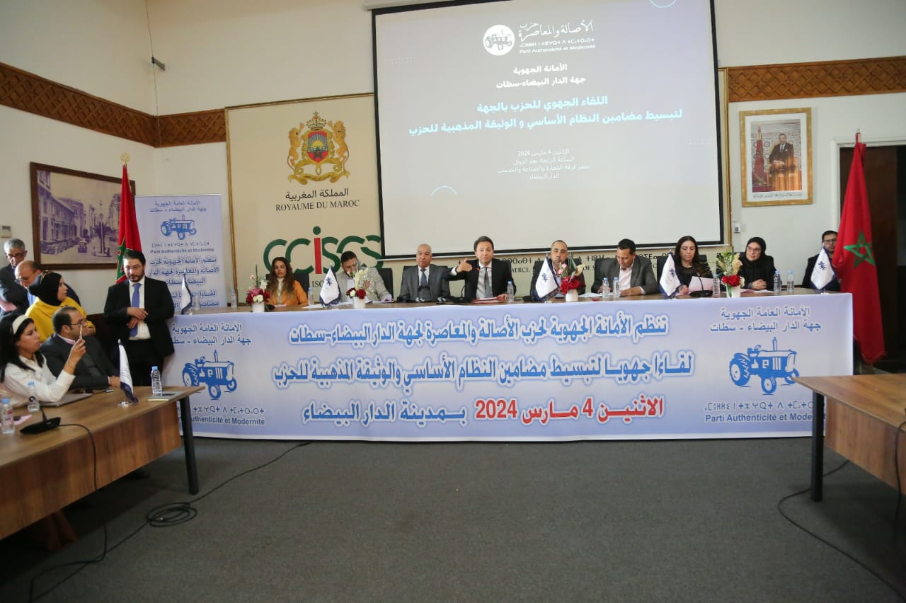 نظمت الأمانة الجهوية لحزب الأصالة والمعاصرة بجهة الدار البيضاء-سطات، اليوم الإثنين 04 مارس 2024 بمقر غرفة التجارة والصناعة والخدمات للجهة، لقاء جهويا خصص لتبسيط مضامين القانون الأساسي والوثيقة المذهبية للحزب.