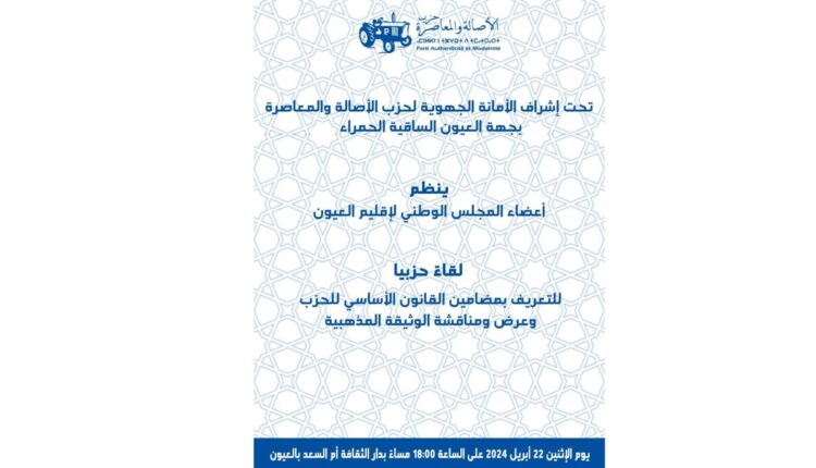 عمــلاً بتوجيهــات القيادة الجماعية للأمانة العامة لحزب الأصالة والمعاصرة، الرامية لتعزيز التواصل الداخلي بين جميع مناضلات ومناضلي الحزب بجميع الجهات وتجويده، تنظم المنسقية الجهوية للحزب بجهة العيون الساقية الحمراء، لقاء حزبيا، لبسط وشرح مضامين القانون الأساسي والوثيقة المذهبية المنبثقة عن المؤتمر الوطني الخامس.