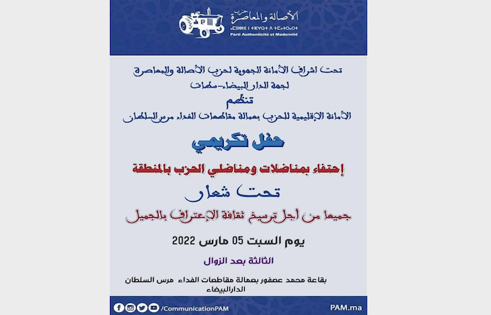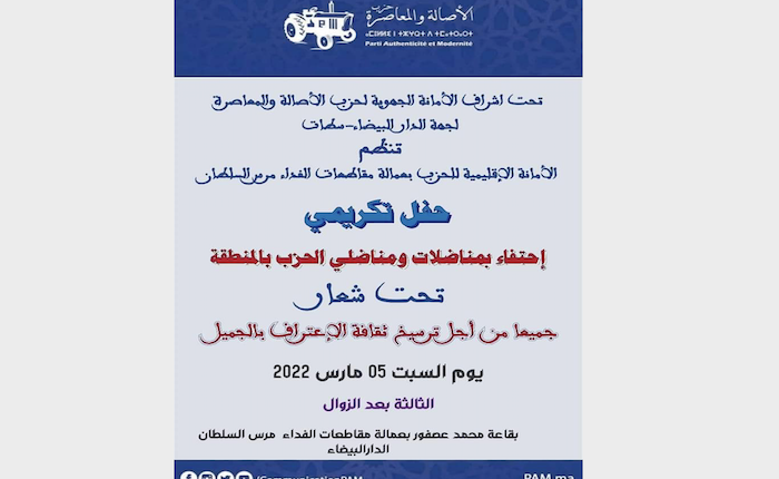 تحت إشراف الأمانة الجهوية لحزب الأصالة والمعاصرة بجهة الدار البيضاء سطات، تنظم الأمانة الإقليمية للحزب بعمالة مقاطعات الفداء مرس السلطان، يوم السبت 05 مارس 2022؛ بقاعة محمد عصفور ابتداء من الثالثة بعد الزوال، حفلا تكريميا احتفاء بمناضلات ومناضلي الحزب بالمنطقة تحت شعار: “جميعا من أجل ترسيخ ثقافة الاعتراف بالجميل”.