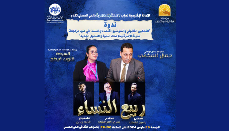 تنظم؛ الأمانة الإقليمية لحزب الأصالة والمعاصرة بعمالة مقاطعة الحي الحسني بالدار البيضاء، ندوة تفاعلية حول موضوع “التمكين القانوني والسوسيو اقتصادي للنساء، في ضوء مراجعة مدونة الأسرة وخلاصات النموذج التنموي الجديد”.