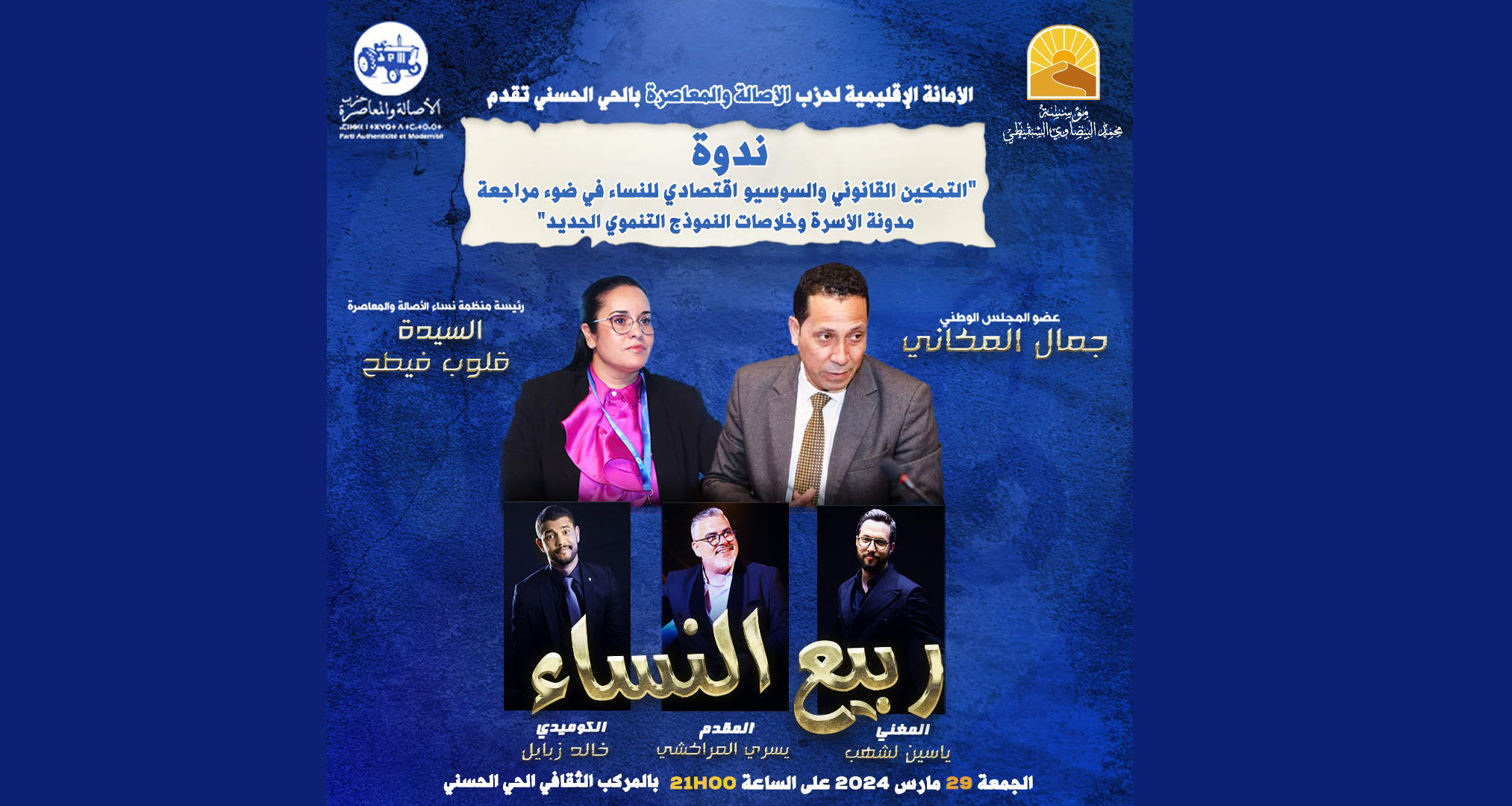وذلك يوم الجمعة 29 مارس 2024 على الساعة 21:00 مساء بالمركب الثقافي الحي الحسني- الدار البيضاء.