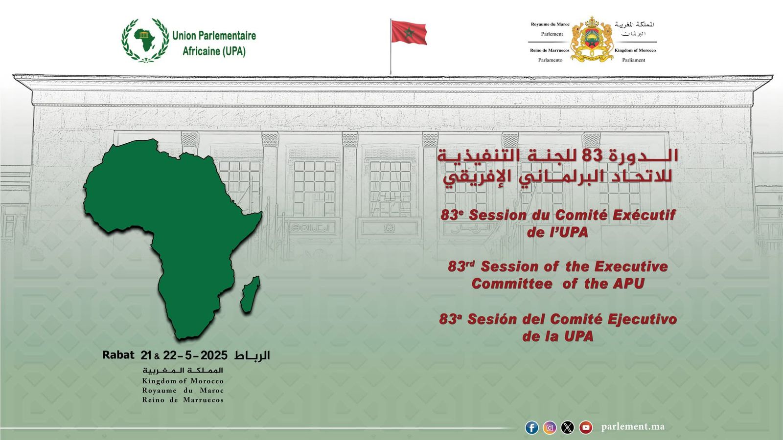 يحتضن، البرلمان المغربي بمجلسيه، مجلس النواب ومجلس المستشارين، أشغال الدورة الثالثة والثمانين (83) للجنة التنفيذية للاتحاد البرلماني الإفريقي، وذلك يومي 21 و22 ماي 2025، بمقر البرلمان بالعاصمة الرباط.