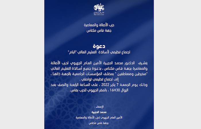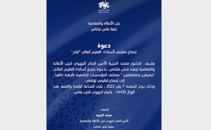 يتشرف؛ الأمين العام الجهوي لحزب الأصالة والمعاصرة بجهة فاس-مكناس؛ الدكتور محمد الحجيرة؛ بدعوة جميع أساتذة التعليم العالي -منخرطين ومتعاطفين- بمختلف المؤسسات الجامعية بالجهة ذاتها، إلى اجتماع تنظيمي تواصلي.