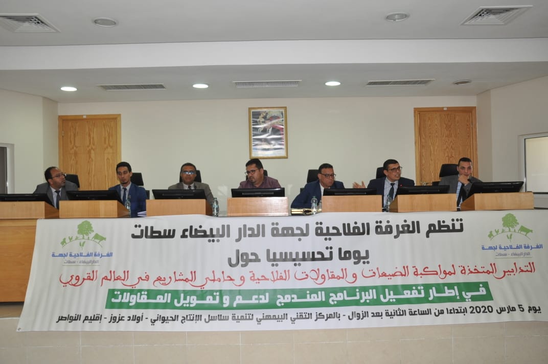 ترأس كل من الغربي الحداوي، عضو الغرفة الفلاحية بجهة الدار البيضاء-سطات، وعبد القادر بن هنية رئيس الجماعة الترابية أولاد عزوز، يوم الخميس 05 مارس 2020، اللقاء التواصلي التحسيسي الذي احتضنه فضاء المركز التقني البيومهني لتنمية سلاسل الإنتاج الحيواني بعين الجمعة بإقليم النواصر.