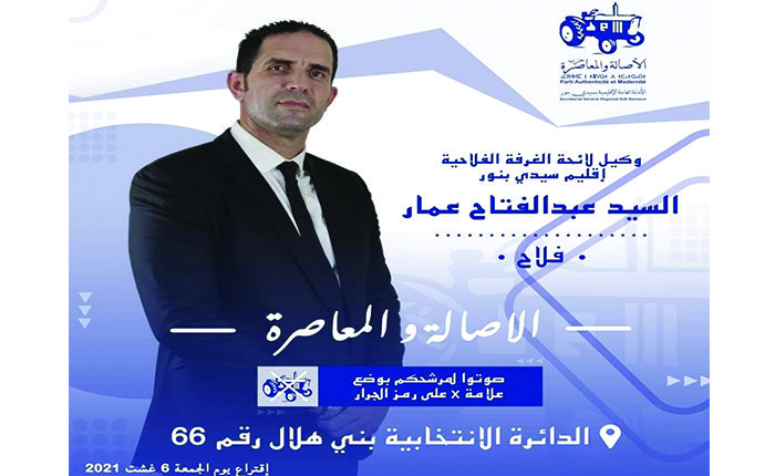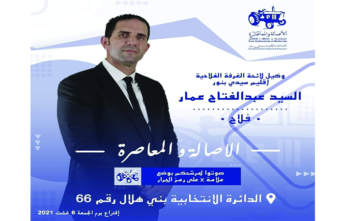 كشف عبد الفتاح عمار وكيل لائحة حزب الأصالة والمعاصرة لانتخاب أعضاء غرفة الفلاحة لجهة الدار البيضاء سطات بإقليم سيدي بنور، أنه في حالة انتخابه سيعمل على أن تضطلع غرف الفلاحة بأدوار طلائعية جديدة، خصوصا في مجال تحديث المنظومة الفلاحية بتطوير هياكل التشغيل والتخصصات، ومن خلال تحصيل أرباح الانتاج، ولكن أيضا من خلال منح أهمية كبيرة للجودة لتلبية احتياجات التوزيع والمستهلكين وأسواق التصدير.