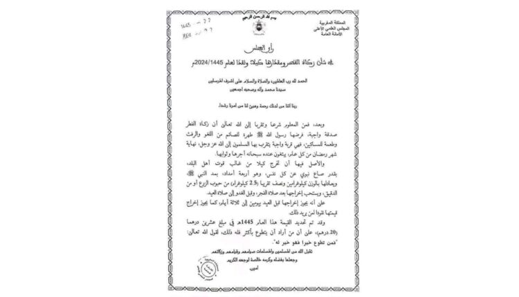 وأضاف أنه “قد تم تحديد القيمة هذا العام 1445 هـ في مبلغ عشرين درهما (20 درهما)”، على أن من أراد أن يتطوع بأكثر فله ذلك، لقول الله تعالى: “فمن تطوع خيرا فهو خير له”.