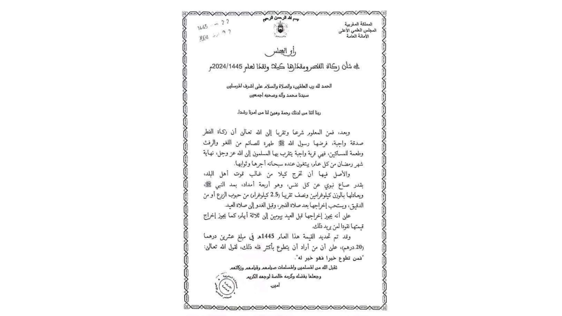 المجلس العلمي الأعلى: 20 درهما مقدار زكاة الفطر نقدا لعام 1445هـ/2024م
