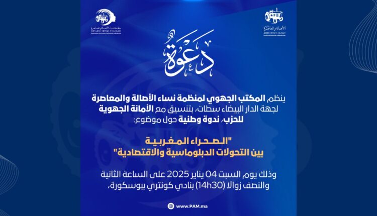 ينظم، المكتب الجهوي لمنظمة نساء الأصالة والمعاصرة بجهة الدار البيضاء- سطات بتنسيق مع الأمانة الجهوية للحزب، ندوة وطنية حول موضوع “الصحراء المغربية بين التحولات الدبلوماسية والاقتصادية”.