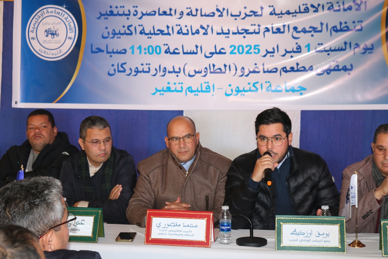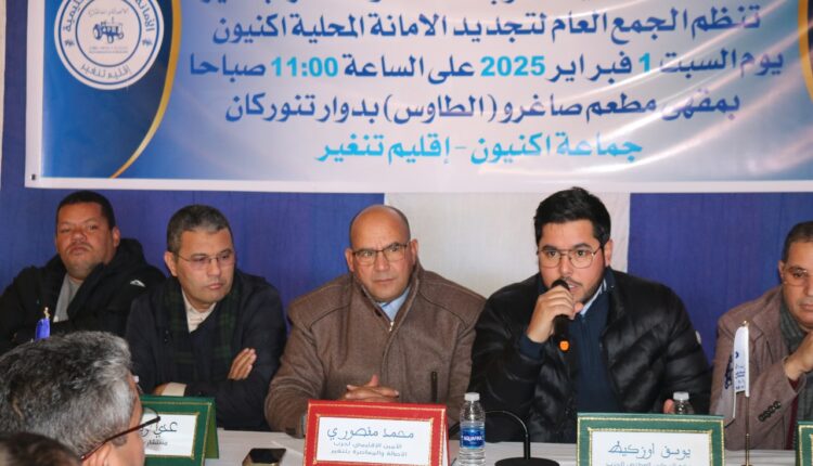 تحت إشراف الأمين الإقليمي لحزب الأصالة والمعاصرة بتنغير محمد منصوري، انعقد الجمع العام لتجديد الأمانة المحلية لجماعة اكنيون، يوم السبت فاتح فبراير 2025، بحضور كل من من أعضاء المجلس الوطني بوسف أوزكيط وسعاد ايت علي، ومحمد الطاهري ومحمد احلوش وعبد الصمد حدا، والمستشار البرلماني عدي ويحيى، والنائب الثاني لرئيس مجموعة جماعات درعة- تافيلالت للتوزيع موحى منصور، ورئيس مجلس جماعة تنغير محمد بالمكي، ورئيس مجلس جماعة واكليم يوسف بوكا، إلى جانب ازيد من مئتي (200) مناضل ومناضلة من مختلف دواوير اكنيون، ومنتخبي الحزب بمختلف جماعات إقليم تنغير.