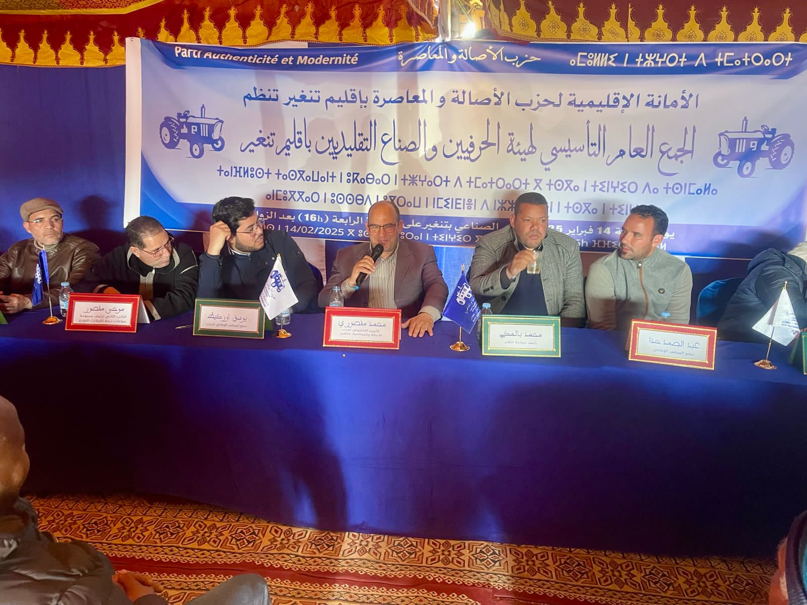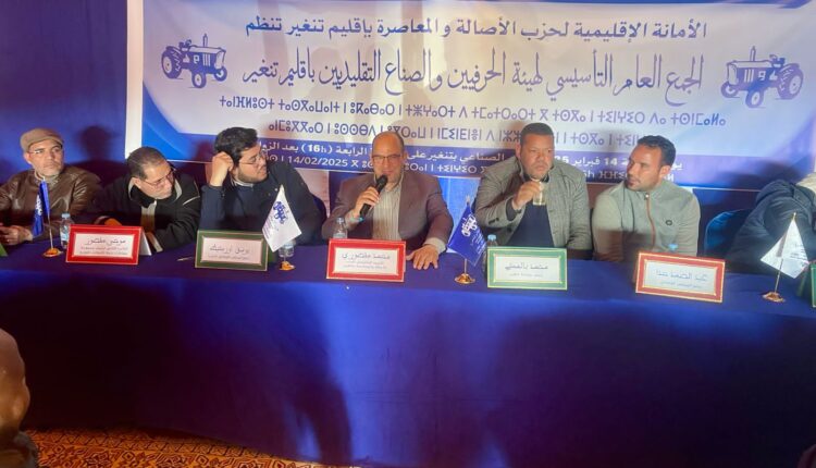 تحت إشراف الأمين الإقليمي لحزب الأصالة والمعاصرة محمد منصوري وبتوجيه من الأمين الجهوي للحزب بجهة درعة تافيلالت مولاي مصطفى العمري، نظمت الأمانة الإقليمية للحزب بتنغير الجمع العام التأسيسي لهيئة الحرفيين والصناع التقليدين للحزب بإقليم تنغير، يوم الجمعة 14 فبراير 2025 بحضور أعضاء المجلس الوطني للحزب يوسف ازكيط، ومحند الطاهيري، وعبد الصمد حدا، ومحمد احلوش، وسعاد ايت علي عضو المجلس الوطني لمنظمة نساء الأصالة والمعاصرة، والنائب الثاني لرئيس مجموعة جماعات درعة- تافيلالت للتوزيع موحى منصورو، ورئيس مجلس جماعة تنغير محمد بالمكي، ورئيس مجلس جماعة واكليم، يوسف بوكا، إلى جانب أزيد من 260 صانعة وصانع تقليدي من مختلف جماعات إقليم تنغير.