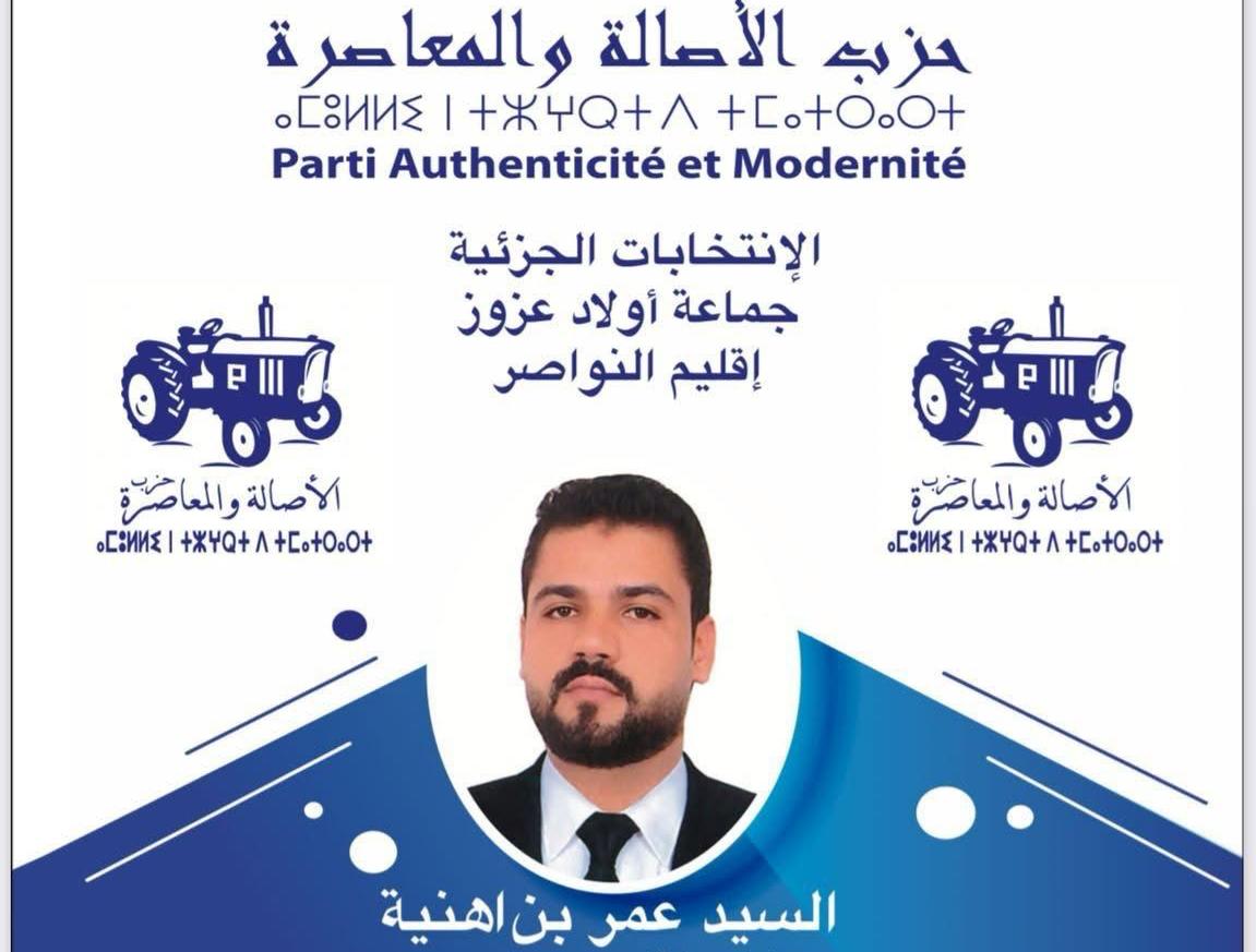 يواصل عمر بن أهنية مرشح حزب الأصالة والمعاصرة بالدائرة الإنتخابية 20 بجماعة أولاد عزوز بإقليم النواصر، حملته الانتخابية بأحياء الجماعة من خلال تواصله مع ساكنته والتعريف بأهدافه وبرنامجه.