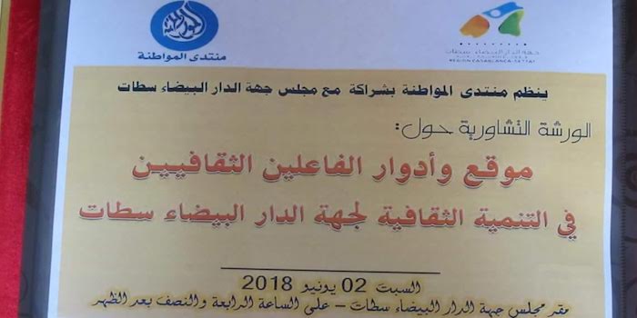 احتضن مقر جهة الدار البيضاء-سطات بحي الأحباس، يوم السبت 02 يونيو 2018، الورشة التشاورية حول موقع وأدوار الفاعلين الثقافيين في التنمية الثقافية بجهة الدارالبيضاء سطات. ونظم مجلس جهة الدار البيضاء-سطات هذا الملتقى الثقافي المميز بشراكة مع منتدى المواطنة، وبتنسيق وتعاون مع وزارة الثقافة والاتصال، وبمشاركة مجموعة من المؤسسات والمنظمات والهيئات والفعاليات الثقافية والجامعية والإعلامية الجهوية والوطنية.
