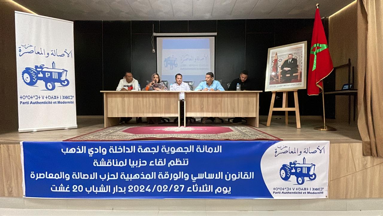 على ضوء مخرجات المؤتمر الوطني الخامس لحزب الأصالة والمعاصرة، التي شددت على ضرورة تعزيز التواصل مع مناضلات ومناضلي الحزب والتعامل مع القضايا الداخلية للحزب عبر نقاش عميق ومستفيض، نظمت الأمانة الجهوية لحزب الأصالة والمعاصرة بجهة الداخلة واد الذهب، مساء يومه الثلاثاء 27 فبراير 2024، لقاءاً تواصلياً ناجحاً مع مناضلات ومناضلي الجهة للتعريف وفتح نقاش حول مضامين الوثيقة المذهبية والقانون الأساسي للحزب.