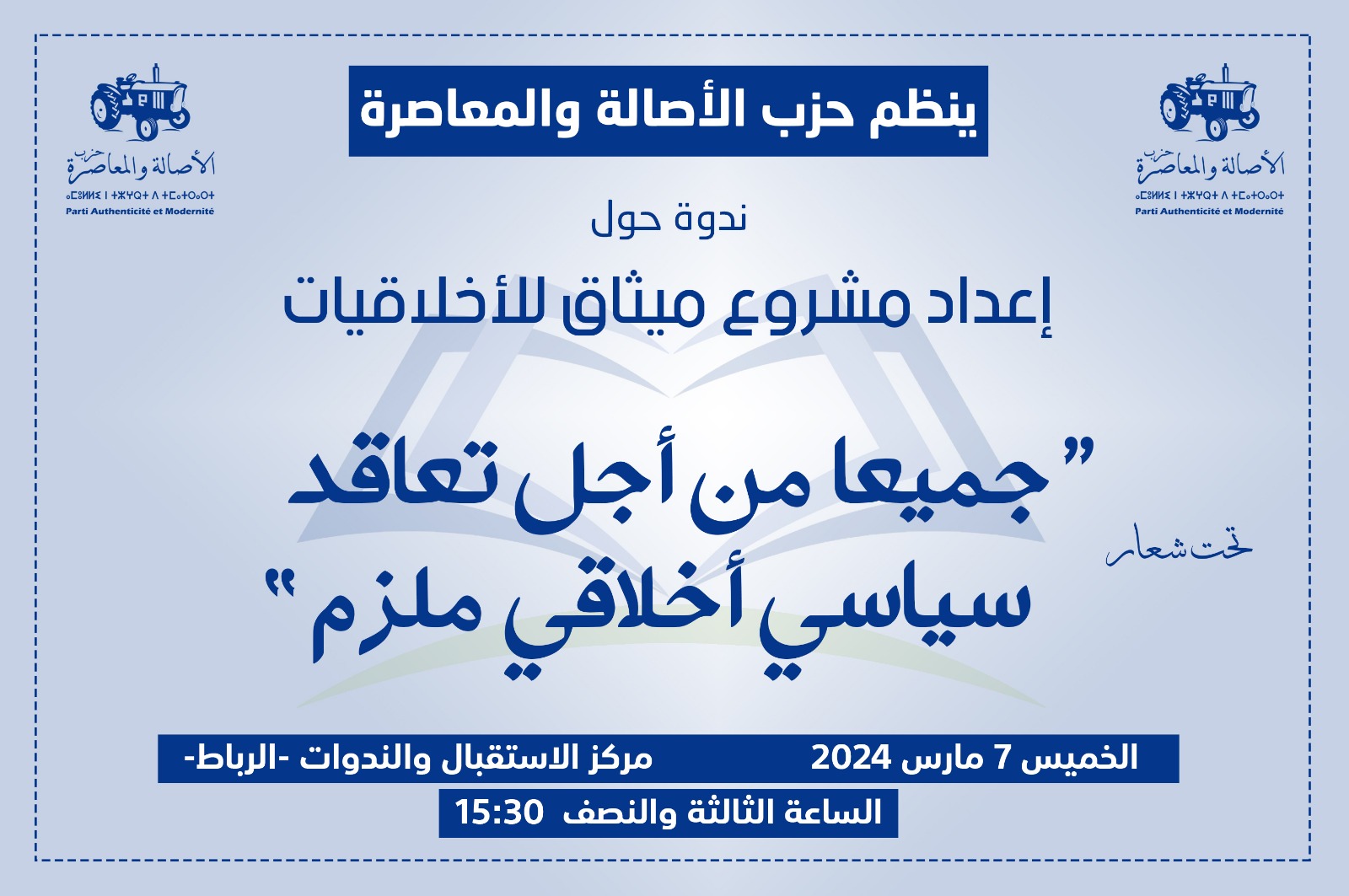 ينظم حزب الأصالة والمعاصرة؛ ندوة حول إعداد مشروع ميثاق للأخلاقيات؛ تحت شعار: “جميعا من أجل تعاقد سياسي أخلاقي ملزم”.