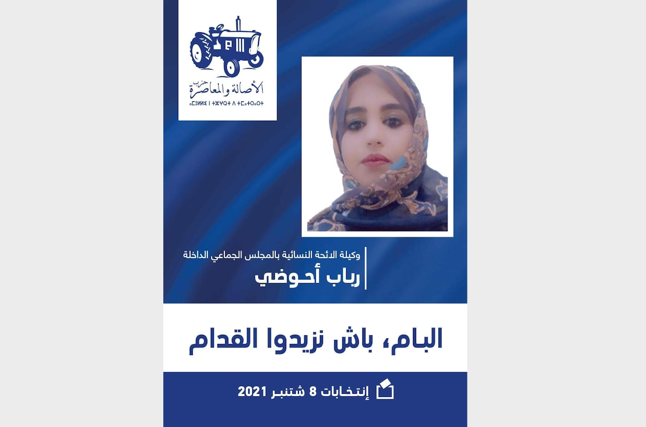 رشحت القيادة الجهوية لحزب الأصالة والمعاصرة بجهة الداخلة وادي الذهب، الإطار رباب احوضي صاحبة مكتب محاسبة، لتكون وكيلة لائحة نساء الاصالة والمعاصرة بمجلس الجماعة الترابية الداخلة، المزمع إجراؤها يوم 8 شتنبر المقبل.