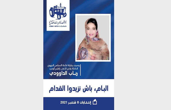 رشحت القيادة الجهوية لحزب الأصالة والمعاصرة بجهة الداخلة وادي الذهب، رباب الداودي، مقاولة ذاتية، لتكون وصيفة وكيلة لائحة نساء الاصالة والمعاصرة بمجلس جهة الداخلة وادي الذهب عن دائرة اقليم اوسرد، المزمع إجراؤها يوم 8 شتنبر المقبل.