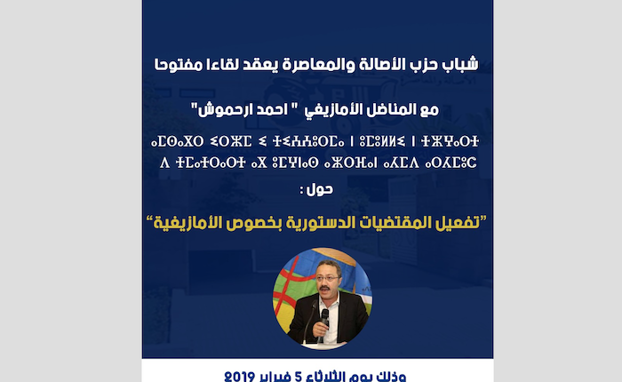 دعت مجموعة من الفعاليات الشبابية داخل حزب الأصالة والمعاصرة إلى فتح النقاش حول “المقتضيات الدستورية بخصوص الأمازيغية”، وفي هذا الإطار تعتزم تنظيم لقاء مفتوح مع المناضل الأمازيغي السيد أحمد ارحموش؛ رئيس فيدرالية الجمعيات الثقافية الأمازيغية، وذلك يوم الثلاثاء 5 فبراير 2019 بالمقر المركزي لحزب الأصالة والمعاصرة بالرباط.