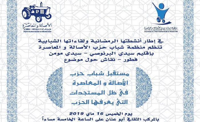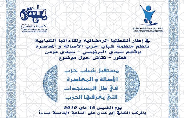 تنظم منظمة شباب حزب الأصالة والمعاصرة بإقليم سيدي البرنوصي سيدي مومن بالدار البيضاء، يوم الخميس 16 ماي 2019 بالمركب الثقافي أبو عنان على الساعة الخامسة مساء، فطور- نقاش حول موضوع “مستقبل شباب حزب الأصالة والمعاصرة في ظل المستجدات التي يعرفها الحزب”.
