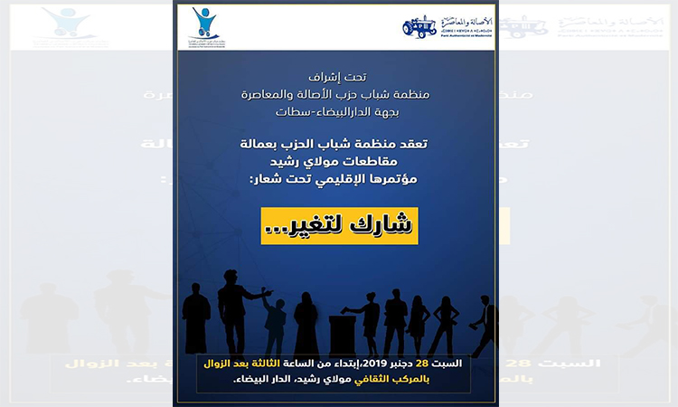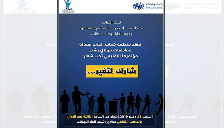 تحت إشراف منظمة شباب حزب الأصالة والمعاصرة بجهة الدار البيضاء سطات، تنظم منظمة شباب حزب الأصالة والمعاصرة بعمالة مقاطعات مولاي رشيد بمدينة الدار البيضاء، يوم السبت 28 دجنبر 2019 ابتداء من الساعة الثالثة بعد الزوال بالمركب الثقافي مولاي رشيد، (تنظم) مؤتمرها الإقليمي تحت شعار: “شارك لتغير …”.