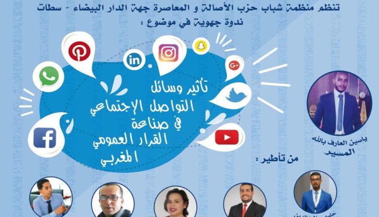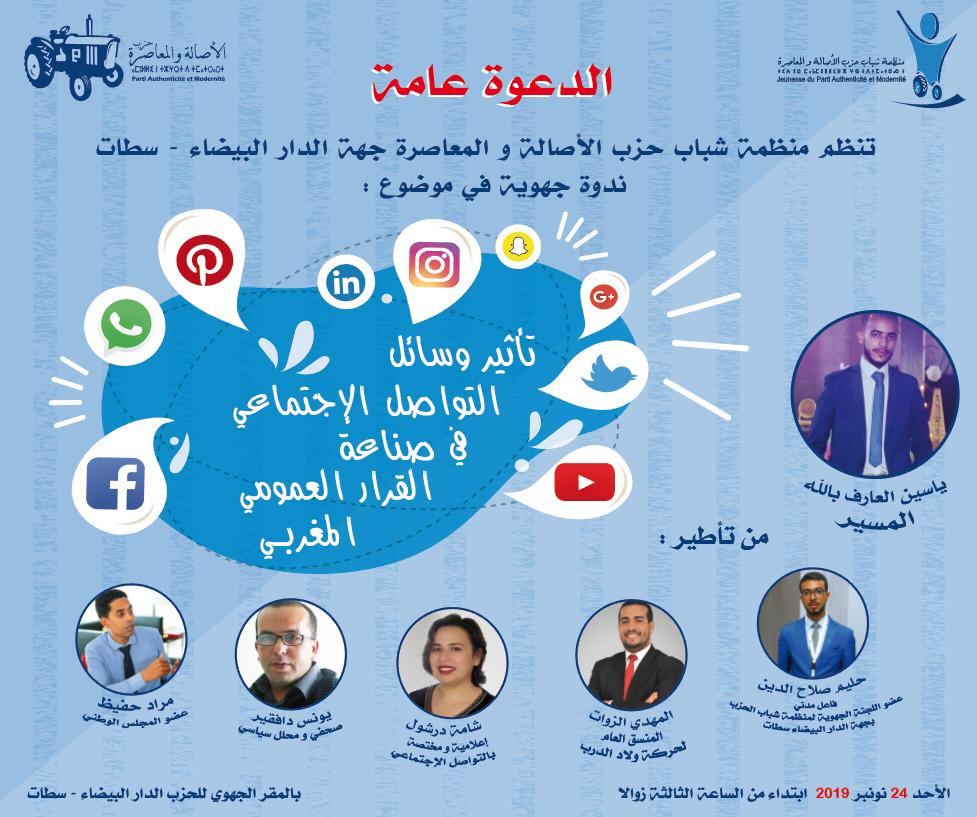 تنظم منظمة شباب حزب الأصالة والمعاصرة لجهة الدار البيضاء سطات، يوم الأحد 24 نونبر 2019 ابتداء من الساعة الثالثة زوالا بالمقر الجهوي للحزب بمدينة الدار البيضاء، (تنظم) ندوة جهوية حول موضوع “تأثير وساىل التواصل الإجتماعي في صناعة القرار العمومي المغربي”.