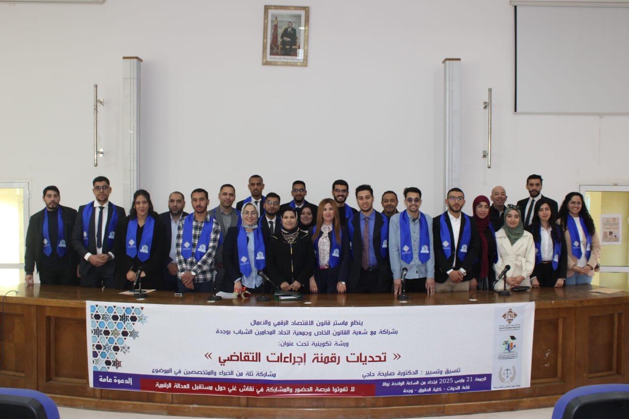 وناقش المشاركون في هذه الورشة، التي نظمها ماستر قانون الاقتصاد الرقمي والأعمال بكلية الحقوق بجامعة محمد الأول بوجدة، مختلف الإشكالات المرتبطة برقمنة العدالة بالمغرب، خاصة في ظل الجهود الرامية إلى إدماج التقاضي الإلكتروني في الإجراءات القضائية وتعزيز استخدام المنصات الرقمية لتبادل المعلومات بين المحامين والأطراف القضائية.