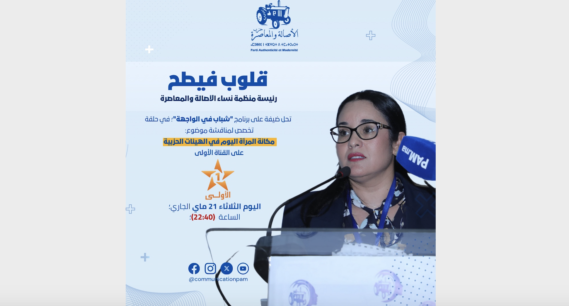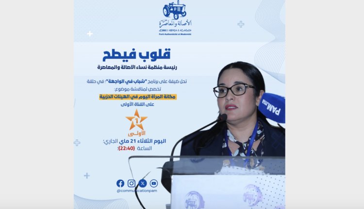 تحل؛ عضو المكتب السياسي- رئيسة منظمة نساء الأصالة والمعاصرة؛ قلوب فيطح؛ ضيفة على برنامج “شباب في الواجهة” (القناة الأولى) في حلقة تخصص لمناقشة موضوع “مكانة المرأة اليوم في الهيئات الحزبية”.
