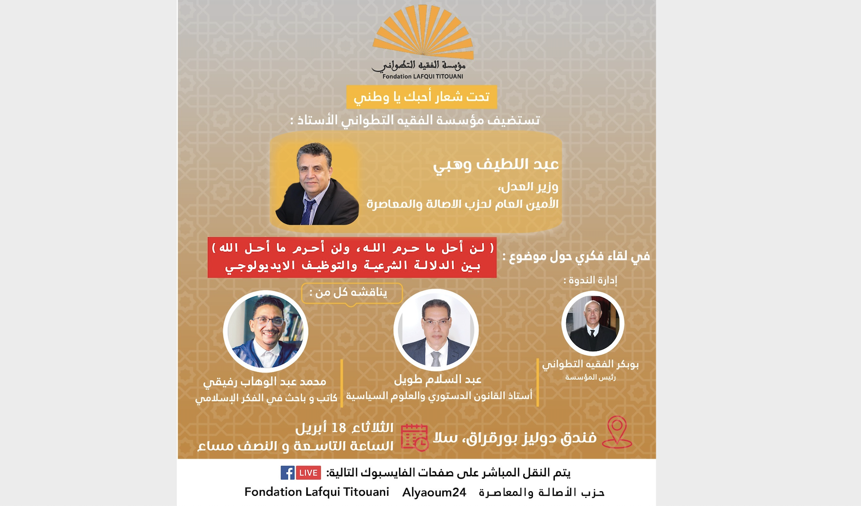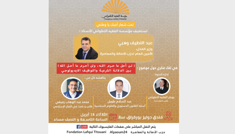 يحل وزير العدل، الأمين العام لحزب الأصالة والمعاصرة؛ السيد عبد اللطيف وهبي؛ يوم غد الثلاثاء 18 أبريل/ 27 رمضان على الساعة 21:30 مساء، ضيفا على مؤسسة الفقيه التطواني، في لقاء فكري حول موضوع “لن أحل ما حرم الله، ولن أحرم ما أحل الله، بين الدلالة الشرعية والتوظيف الأيديولوجي ”.