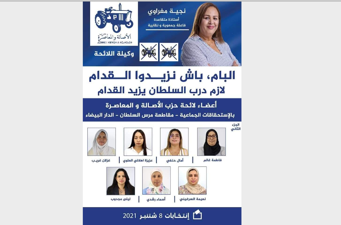 اختار حزب الأصالة والمعاصرة السيدة نجية المغراوي وكيلة للائحة الإضافية لمقاطعة مرس السلطان بمدينة الدار البيضاء، نظرا لتجربتها السياسية الغنية والكبيرة في مجال تدبير الشأن المحلي، وكذلك في مجال العمل الجمعوي والنقابي.