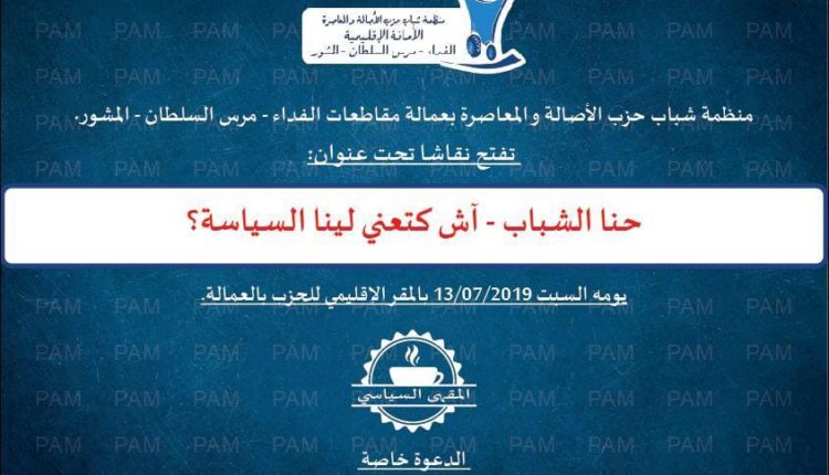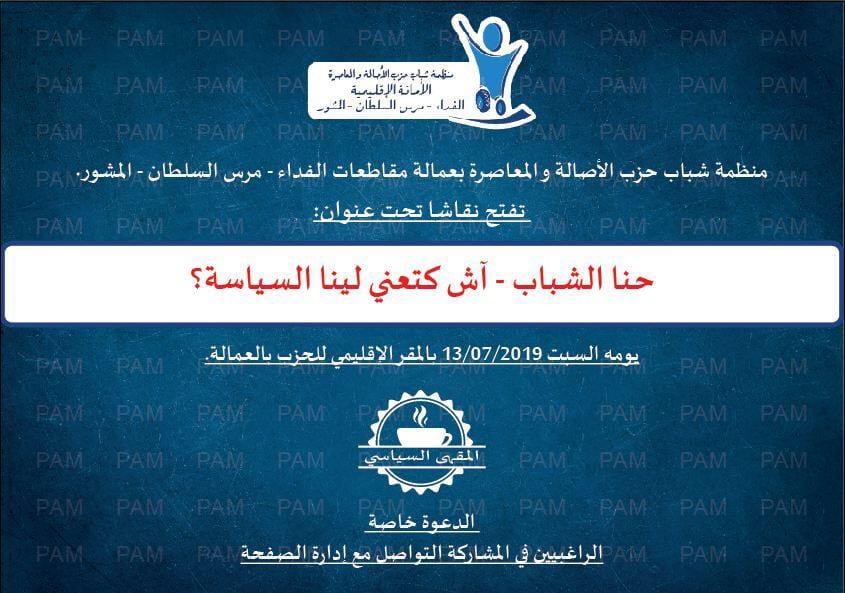 تنظم منظمة شباب حزب الأصالة والمعاصرة بعمالة مقاطعات الفداء مرس السلطان المشور بالدار البيضاء، التي يرأسها اسماعيل فاديا، يوم السبت 13 يوليوز 2019 بالمقر الإقليمي للحزب، (تنظم) ندوة مفتوحة تحت عنوان: “حنا الشباب – آش كتعني لينا السياسة”.