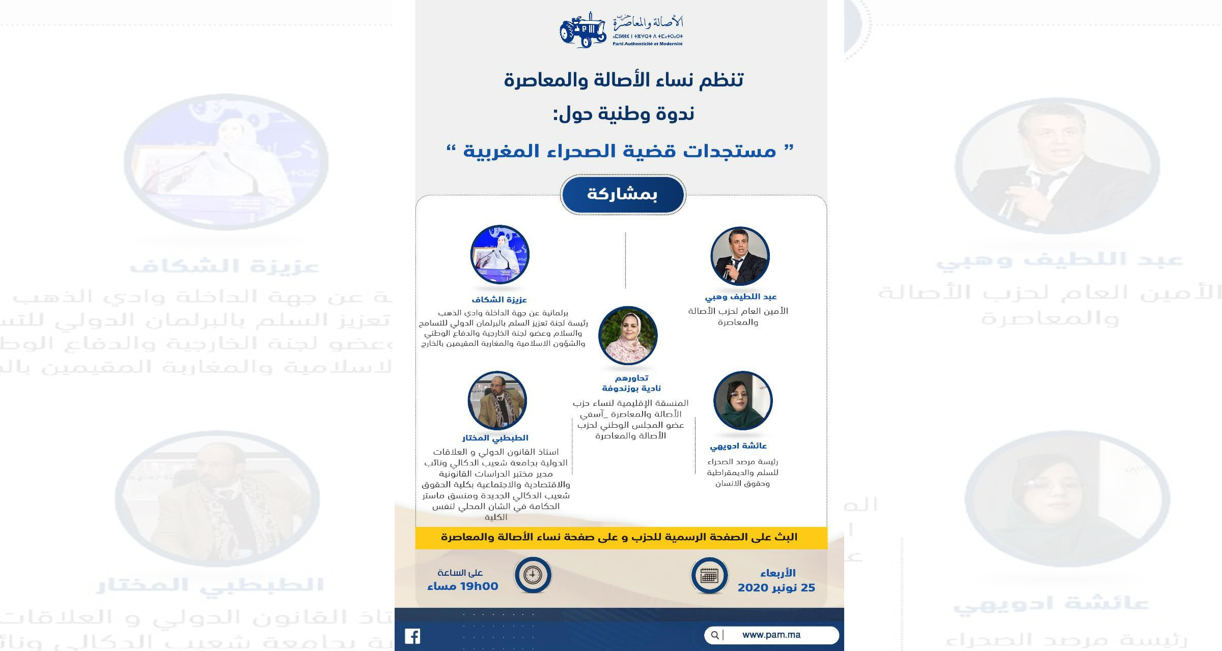 تنظم نساء الأصالة والمعاصرة، يوم الأربعاء 25 نونبر 2020 ابتداء من الساعة السابعة مساء، ندوة وطنية حول “مستجدات قضية الصحراء المغربية”، حيث سيتم بث أطوارها على الصفحة الرسمية للحزب وعلى صفحة نساء الأصالة والمعاصرة، وستتكلف نادية بوزندوفة المنسقة الإقليمية لنساء حزب الأصالة والمعاصرة بآسفي وعضو المجلس الوطني لحزب الأصالة والمعاصرة، بمحاورة الضيوف.