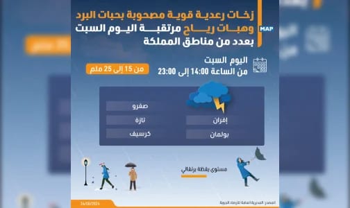 أفادت المديرية العامة للأرصاد الجوية بأن زخات رعدية قوية مصحوبة بحبات البرَد وبهبات رياح مرتقبة، اليوم السبت، بعدد من مناطق المملكة.