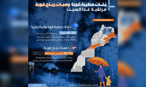 أفادت؛ المديرية العامة للأرصاد الجوية، بأنه يرتقب أن تشهد عدة من مناطق المملكة، يوم غد السبت 20 أبريل الجاري، زخات مطرية قوية وأحيانا رعدية، تتراوح مقاييسها ما بين 25 و40 ملم، وهبات رياح قوية (70 -85 كيلومتر في الساعة) مع تطاير محلي للغبار.