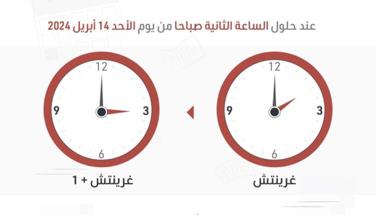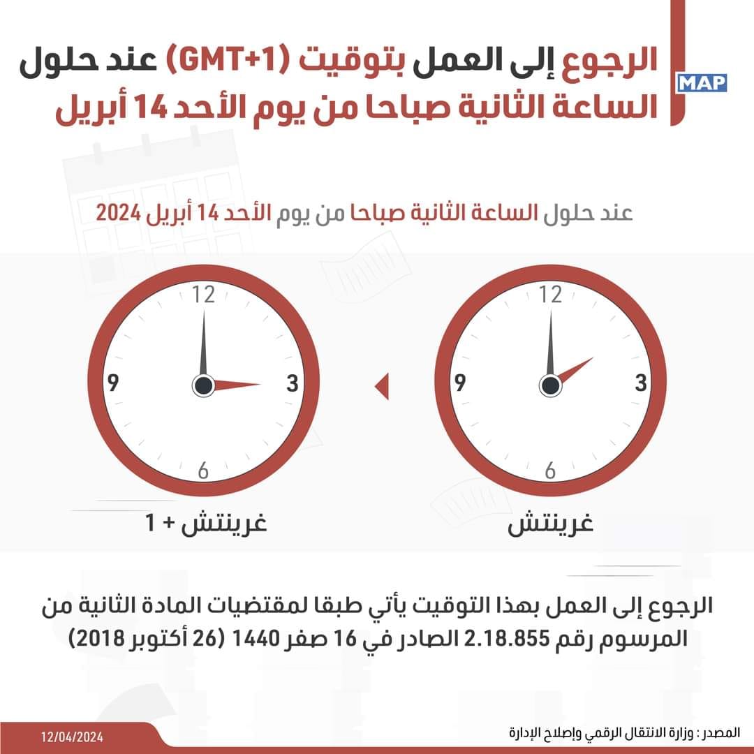 أعلنت وزارة الانتقال الرقمي وإصلاح الإدارة؛ أنه سيتم الرجوع إلى العمل بتوقيت (GMT+1)، وذلك بإضافة ستين (60) دقيقة إلى الساعة القانونية للمملكة عند حلول الساعة الثانية صباحا من يوم الأحد 14 أبريل 2024.