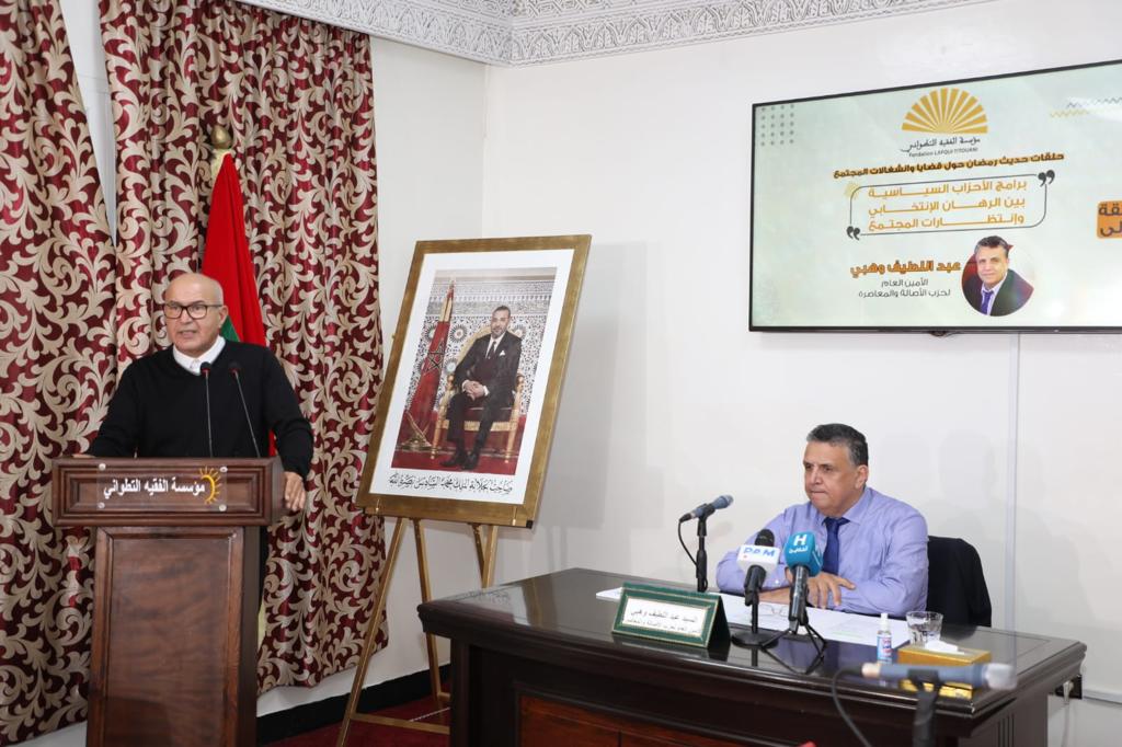 أكــــــــــــد، الأمين العام لحزب الأصالة والمعاصرة، السيد عبد اللطيف وهبي، خلال حلوله مساء اليوم السبت 17 أبريل الجاري، ضيفاً على مؤسسة الفقيه التطواني، لمناقشة موضوع: “برامج الأحزاب السياسية بين الرهان الانتخابي وانتظارات المجتمع”، أن الأحزاب المغربية لعبت دورا مهما في العديد من المحطات الحاسمة والكبرى في تاريخ المغرب، ولها امتداد من الأداء والتواجد في المشهد السياسي الوطني منذ أزيد من 60 عاما.