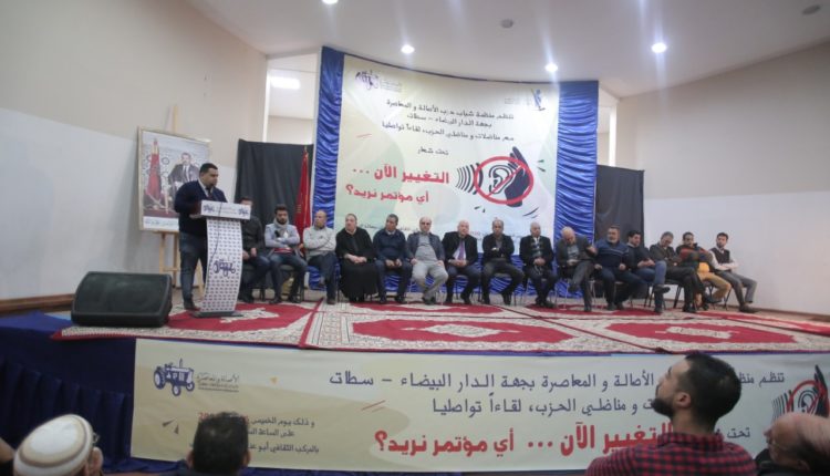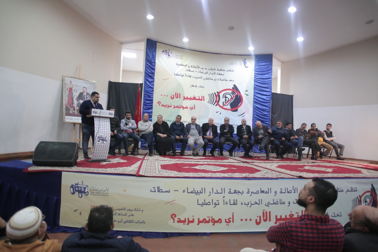 نظمت منظمة شباب حزب الأصالة والمعاصرة بجهة الدار البيضاء سطات، يوم الخميس 16 يناير 2020 بالمركب الثقافي أبو عنان بسيدي البرنوصي بمدينة الدار البيضاء سطات، لقاء تواصليا تحت شعار “التغيير الآن… أي مؤتمر نريد؟”، وذلك بحضور الشرقاوي إيدار المنسق الجهوي لمنظمة شباب حزب الأصالة والمعاصرة بجهة الدار البيضاء سطات، ومحمد بن جلون التويمي المنسق الجهوي للجهة، وأحمد بريجة نائب المنسق الجهوي المكلف بعمالة الدار البيضاء، إضافة إلى العديد من قيادات الحزب ومناضلات ومناضلي الحزب بالجهة.