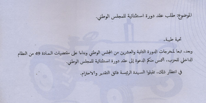 وبعد، تبعا لمخرجات الدورة الثانية والعشرين للمجلس الوطني؛  وبناء على مقتضيات الـمـادة 49 من النظام الداخلي للحزب، ألتمس منكم الدعوة إلى عقد دورة استثنائية للمجلس الوطني.